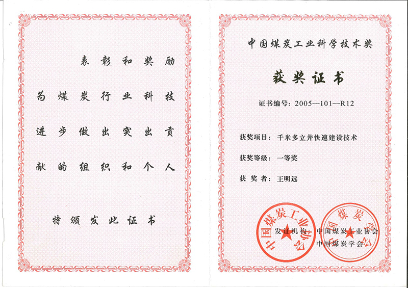 2005年中國煤炭工業(yè)科學技術(shù)獎一等獎